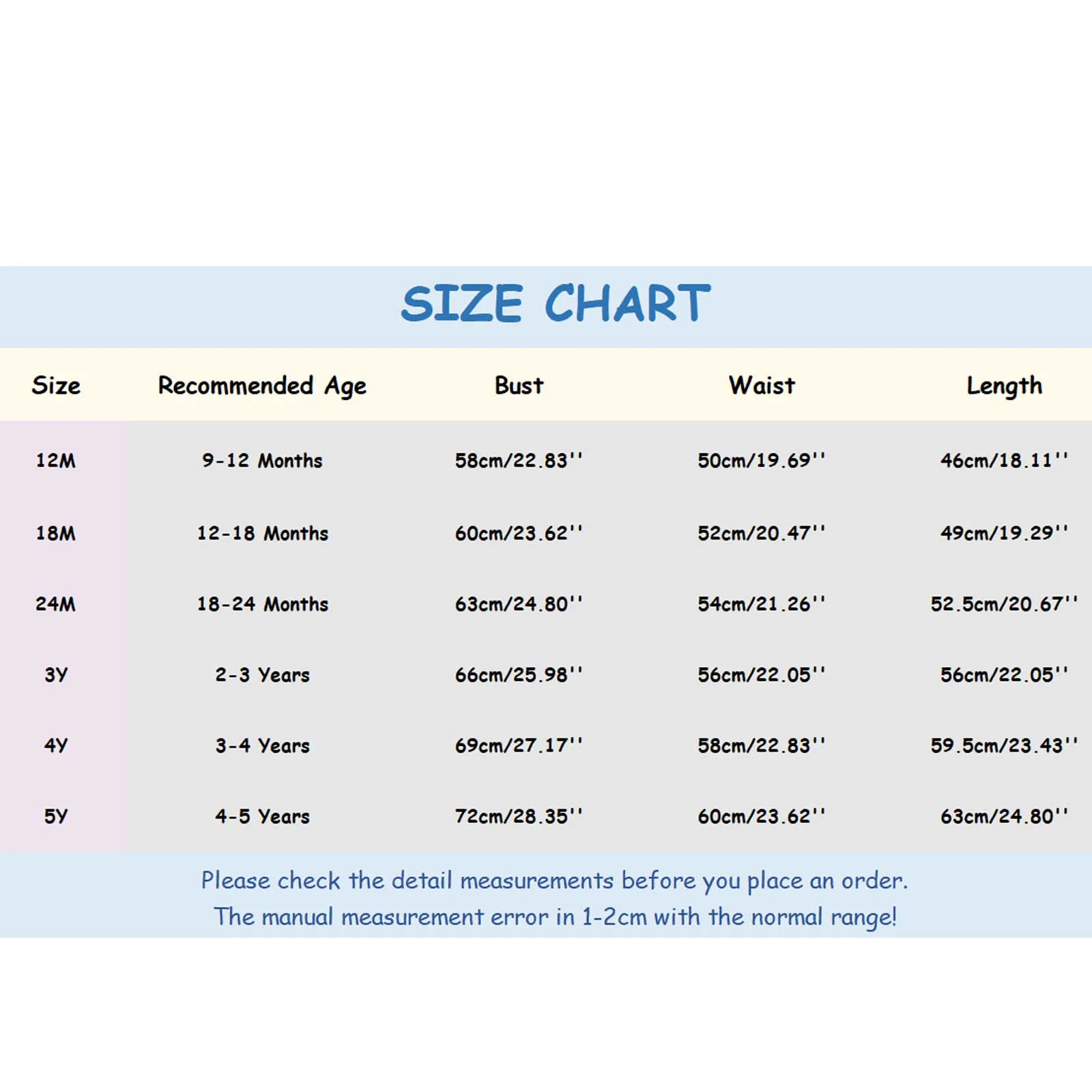 | Size:5Y | Recommended Age:4-5 Years | Bust:72cm/28.35'' | Waist:60cm/23.62'' | Length:63cm/24.80'' |